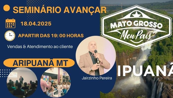 Na Cidade de Juína MT. Acontecera no dia 04 de outubro de 2025, um grande seminário de desenvolvimento pessoal em vendas e atendimento ao cliente, Jairzinho Pereira um dos maiores palestrantes do Brasil estará realizando esse grande momento, através da sua empresa ZAN NORTE TREINAMENTOS, serão 04 horas de muito, contudo de valor, que vem de encontro às necessidades da classe empresarial.